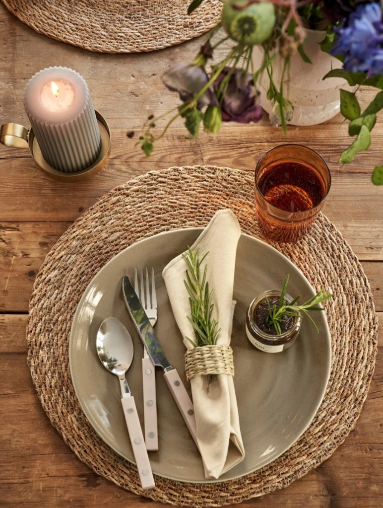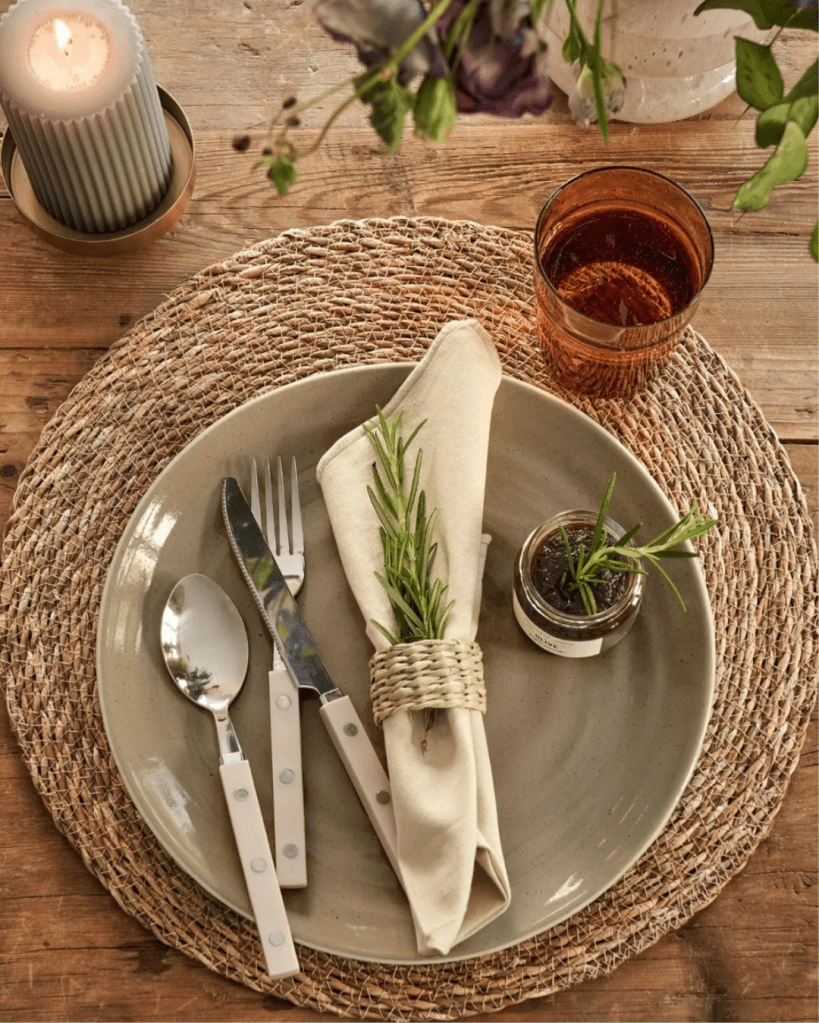 Ces jolis set de table en jonc de mer sont idéals pour créer un contraste entre nos tables en bois ou une nappe et l’assiette.