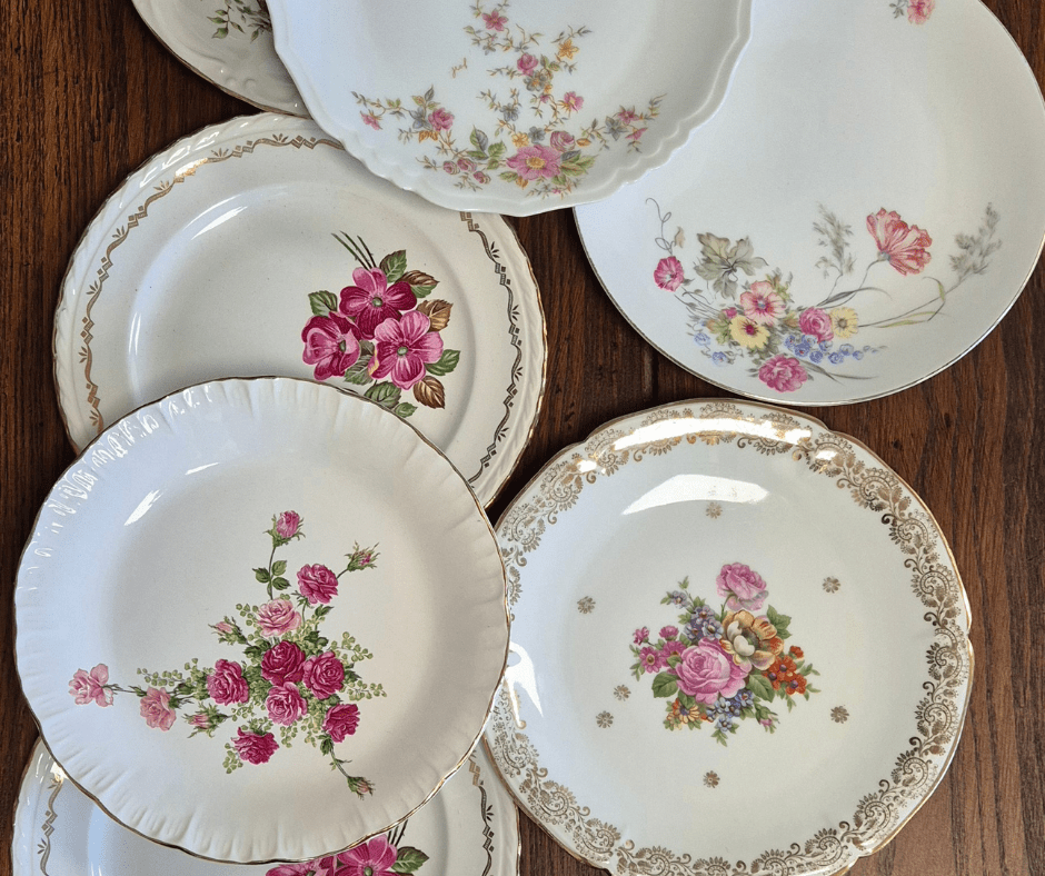 Jolies assiettes anciennes dépareillées, fleuris, unies, avec des dorures, un beau mélange qui apportera un effet raffiné et chic à votre table.