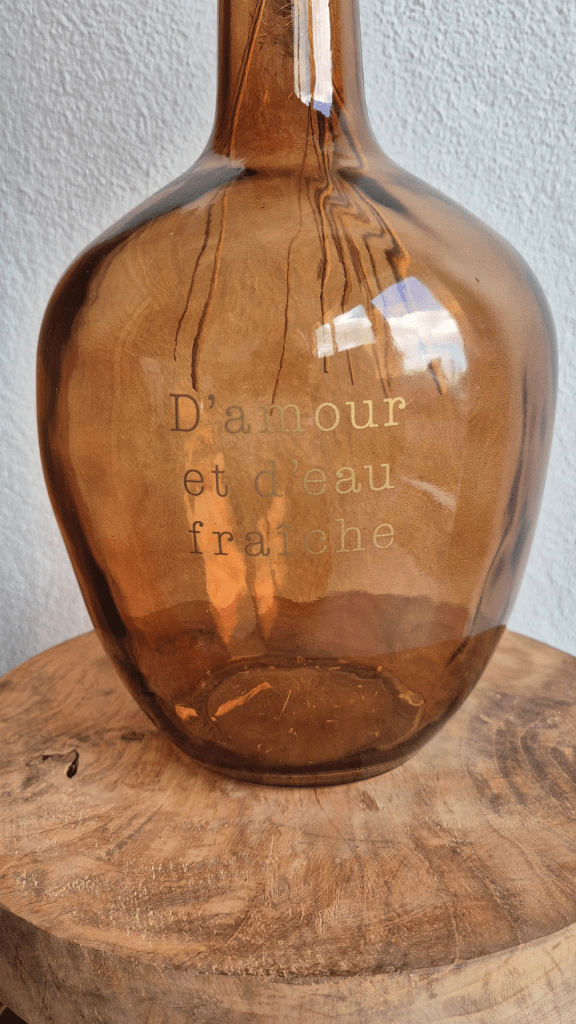 Elle est ornée de l’inscription dorée « d’amour et d’eau fraîche », un détail qui attire le regard tout en restant élégant et discret.