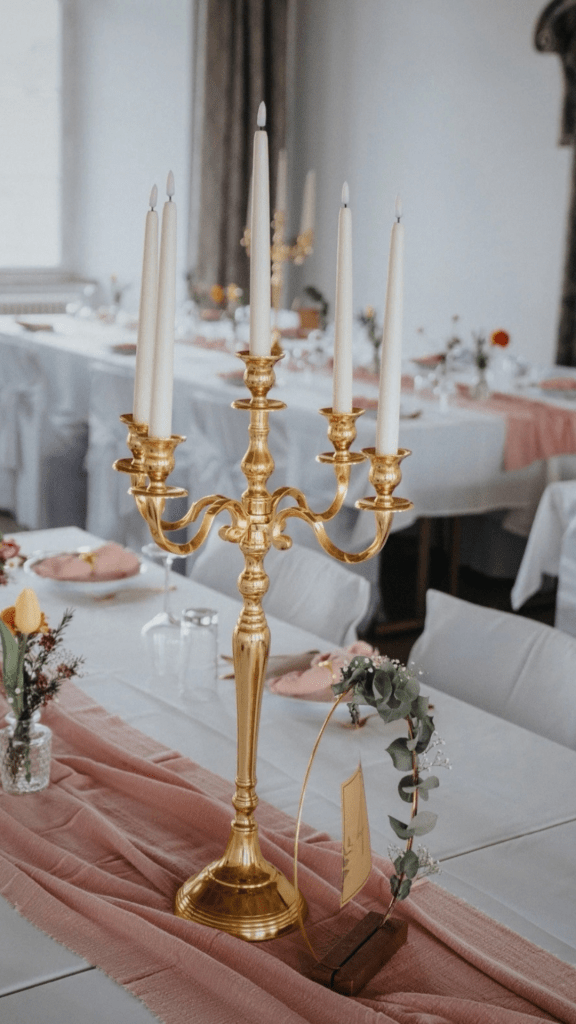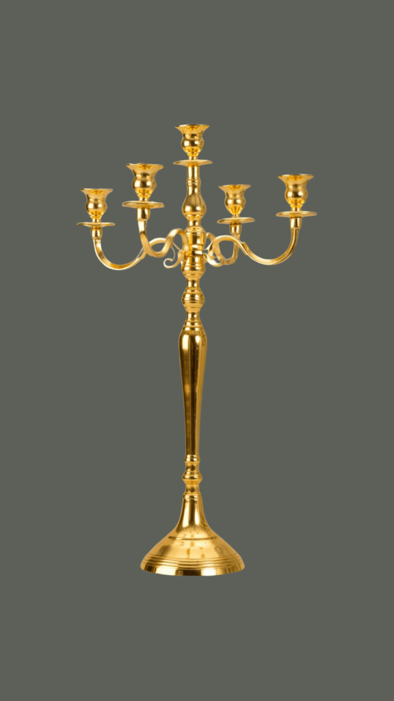 Apportez une touche de majesté à votre table avec notre chandelier doré à 5 branches. D’une hauteur de 60 cm, il incarne l’élégance classique et s’intègre parfaitement dans des ambiances chic, romantiques ou baroques.