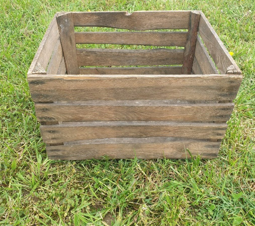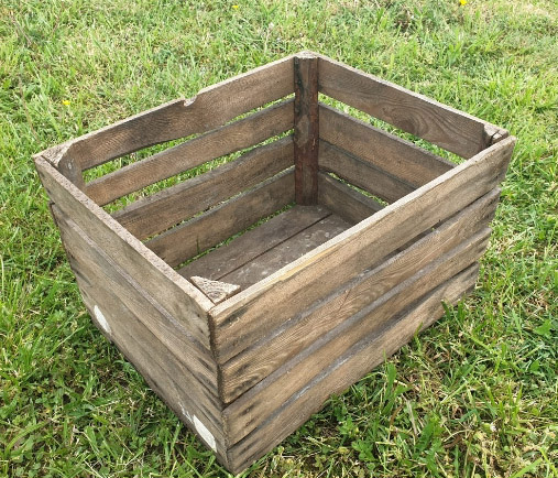 Caisses à pommes en bois vieilli, différentes tailles et différents tons de couleur, idéales pour une décoration vintage et champêtre.