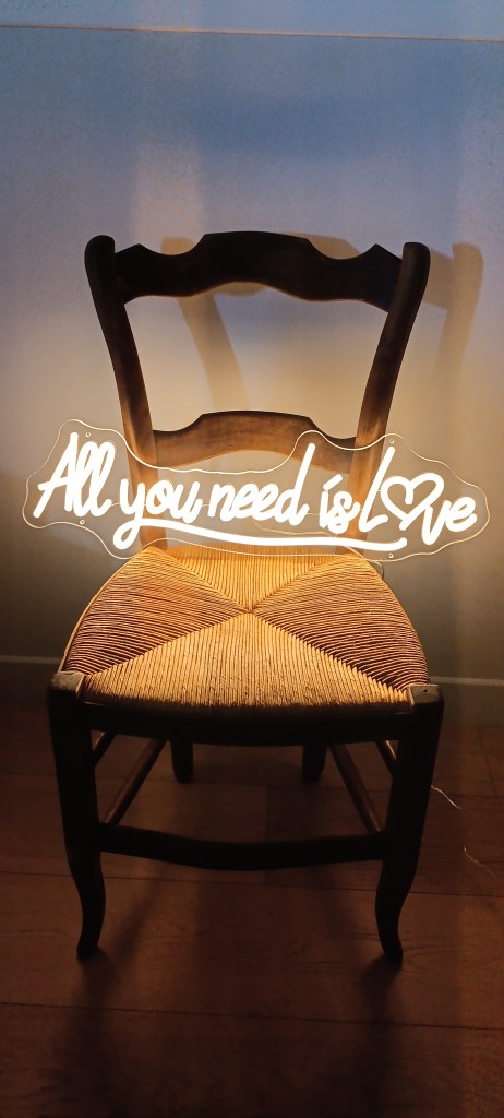 Le néon All you need is love est de couleur blanc chaud et mesure 60 cm x 17 cm, alimentation par port USB à brancher sur une prise.