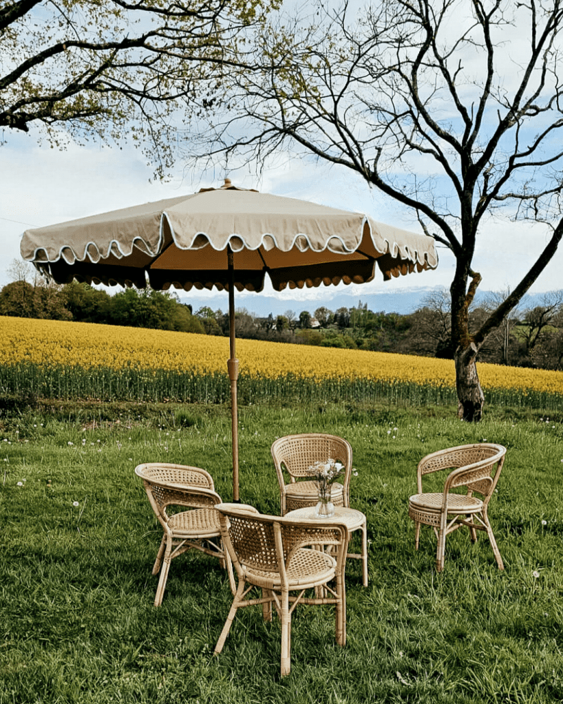 Que diriez vous de proposer des coins ombragés et confortables à vos invités ? Cela devient possible avec ce joli parasol beige doté de liserés blancs très élégants. Ses volants apportent un look résolument vintage bohème alliant fonctionnalité et esthétique.