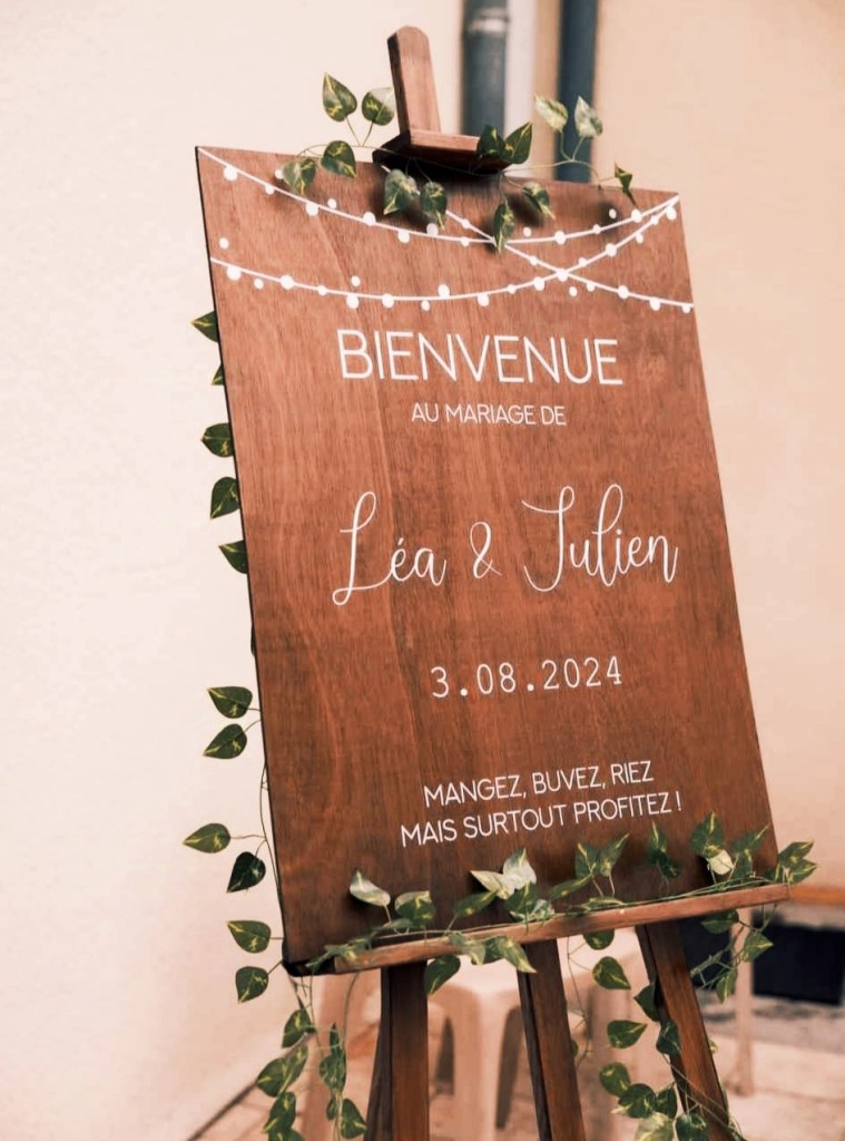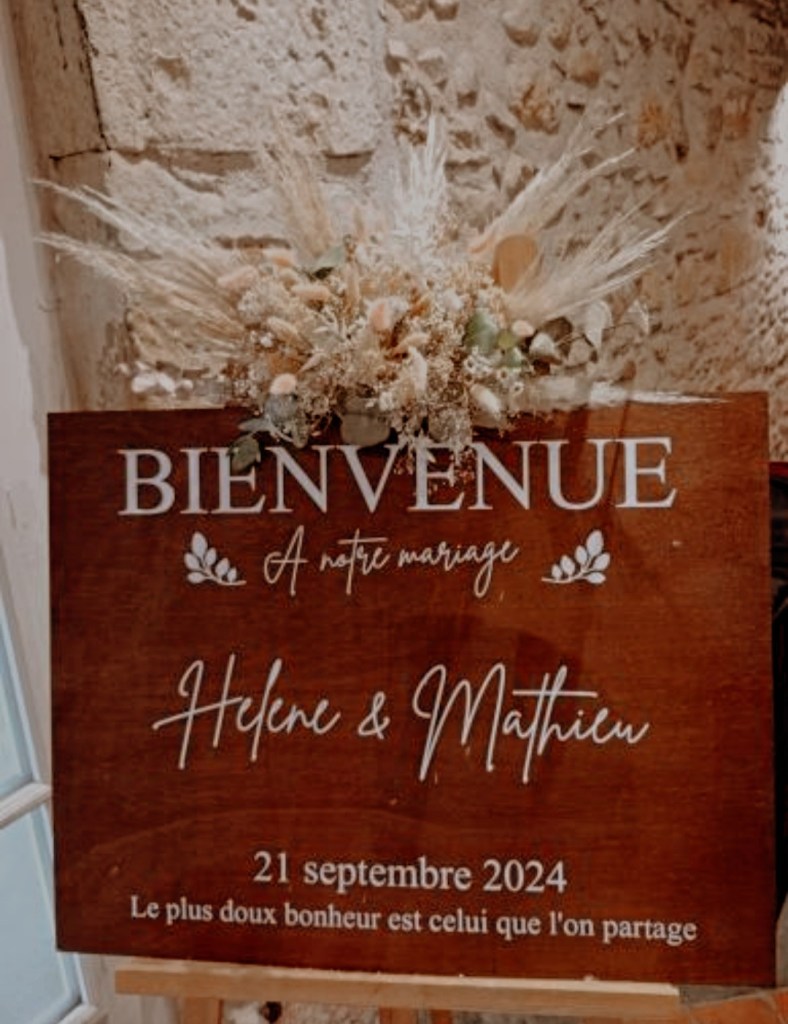 Panneau de bienvenue en bois avec sticker blanc personnalisable, parfait pour accueillir vos invités.