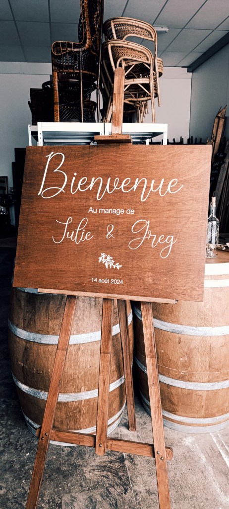 Panneau avec sticker blanc » prenez un gobelet, trinquez avec les mariés et gardez le en souvenir de cette journée », parfait pour accompagner vos écocup.