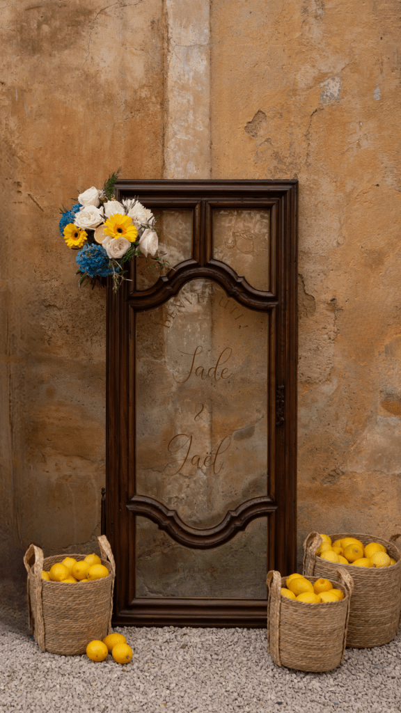 Un panneau de bienvenue : Suspendez un textile drapé ou un panneau en bois, plexiglas, ou tout autre matériau pour souhaiter la bienvenue avec raffinement.