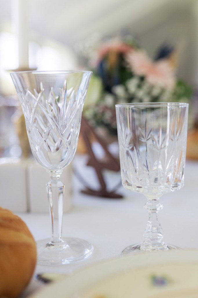 Verres en cristal dépareillées : verre à vin, verre à eau, flûtes