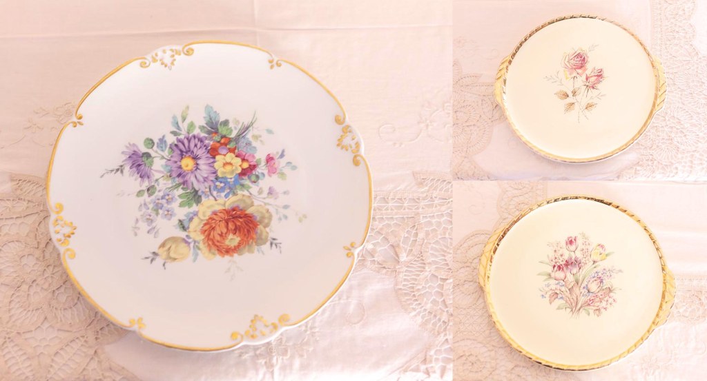 Jolis plats à gâteau anciens dépareillés fleuris avec dorures, idéals pour présenter vos gâteaux, desserts, mignardises.