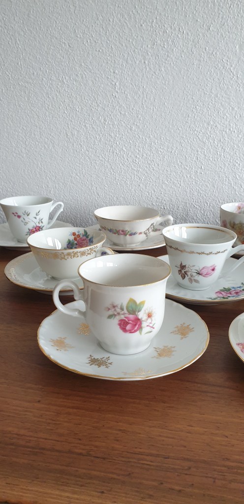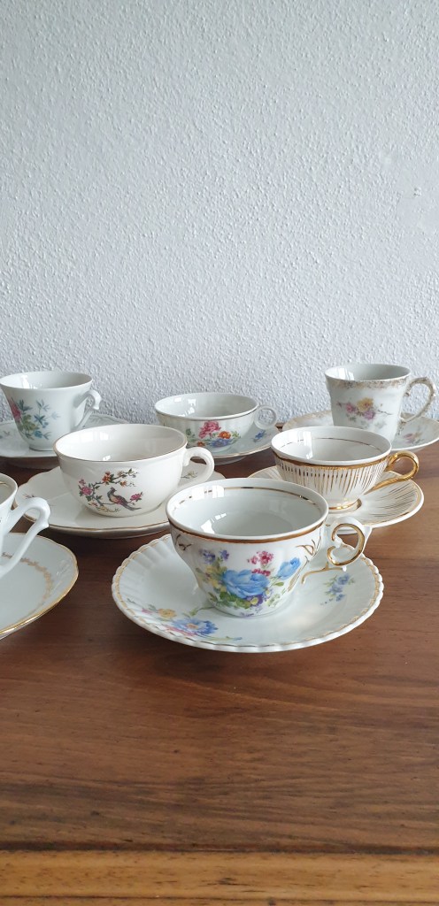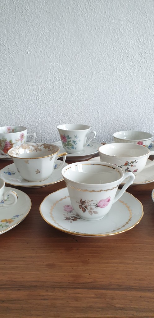Jolies tasses et sous tasses anciennes dépareillées, fleuris, unies, avec des dorures, un beau mélange qui apportera un effet raffiné et chic à votre table.