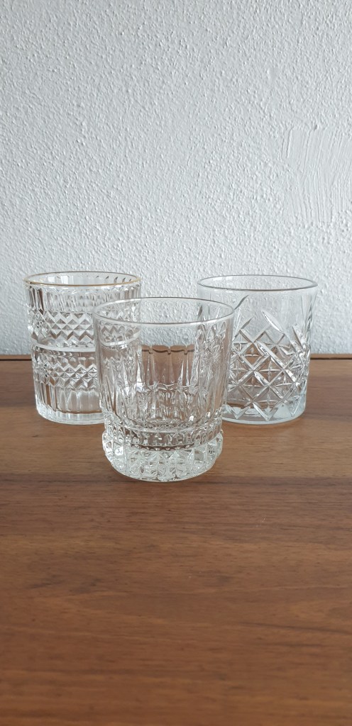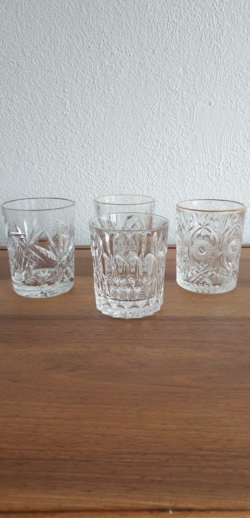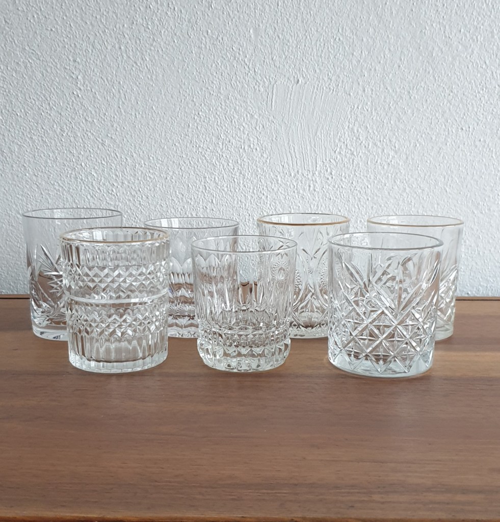 Verres à whisky dépareillés, ciselés ou avec de jolis motifs.
