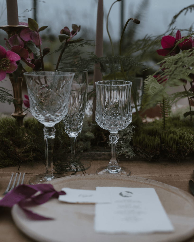Verres en cristal dépareillées : verre à vin, verre à eau, flûtes